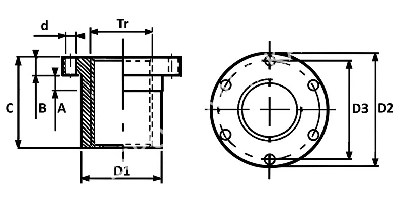 Гайка трапецеидальная полиамидная (POM) PFA 24х5 с фланцем (правая резьба), EMT